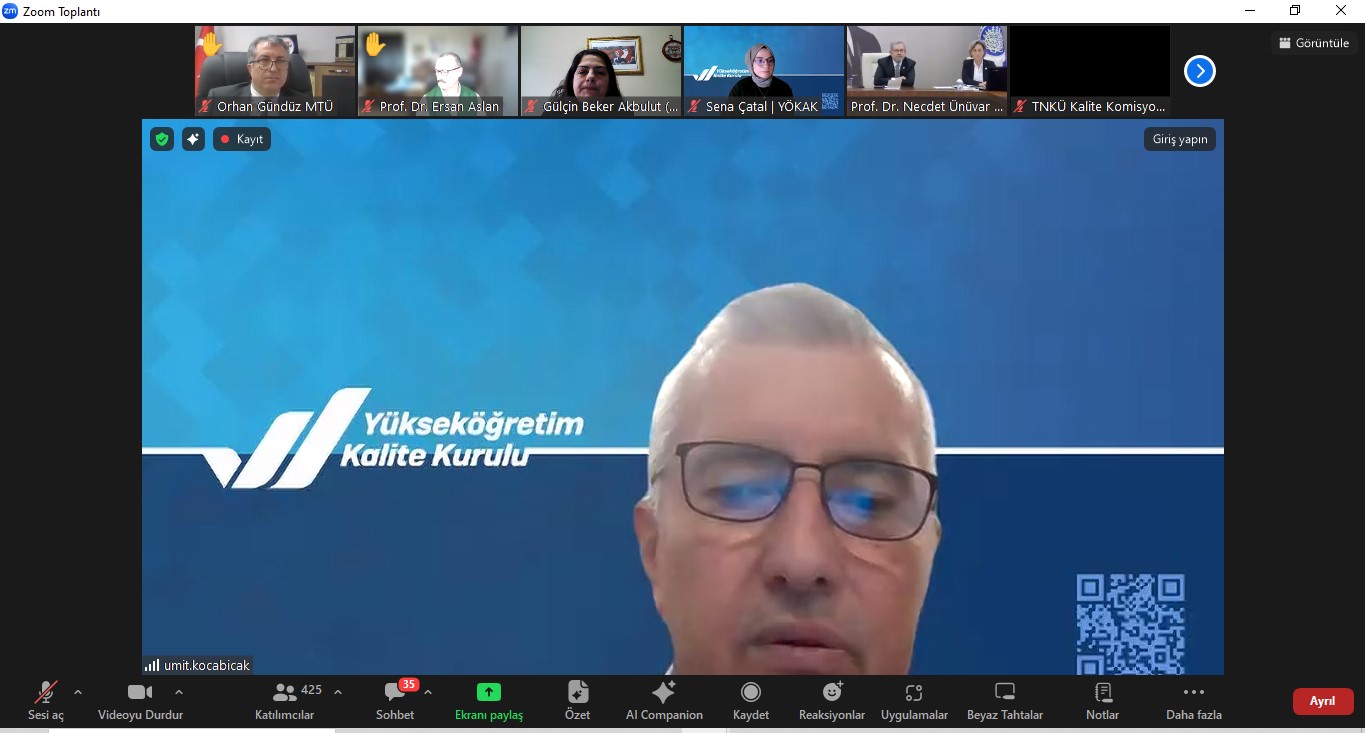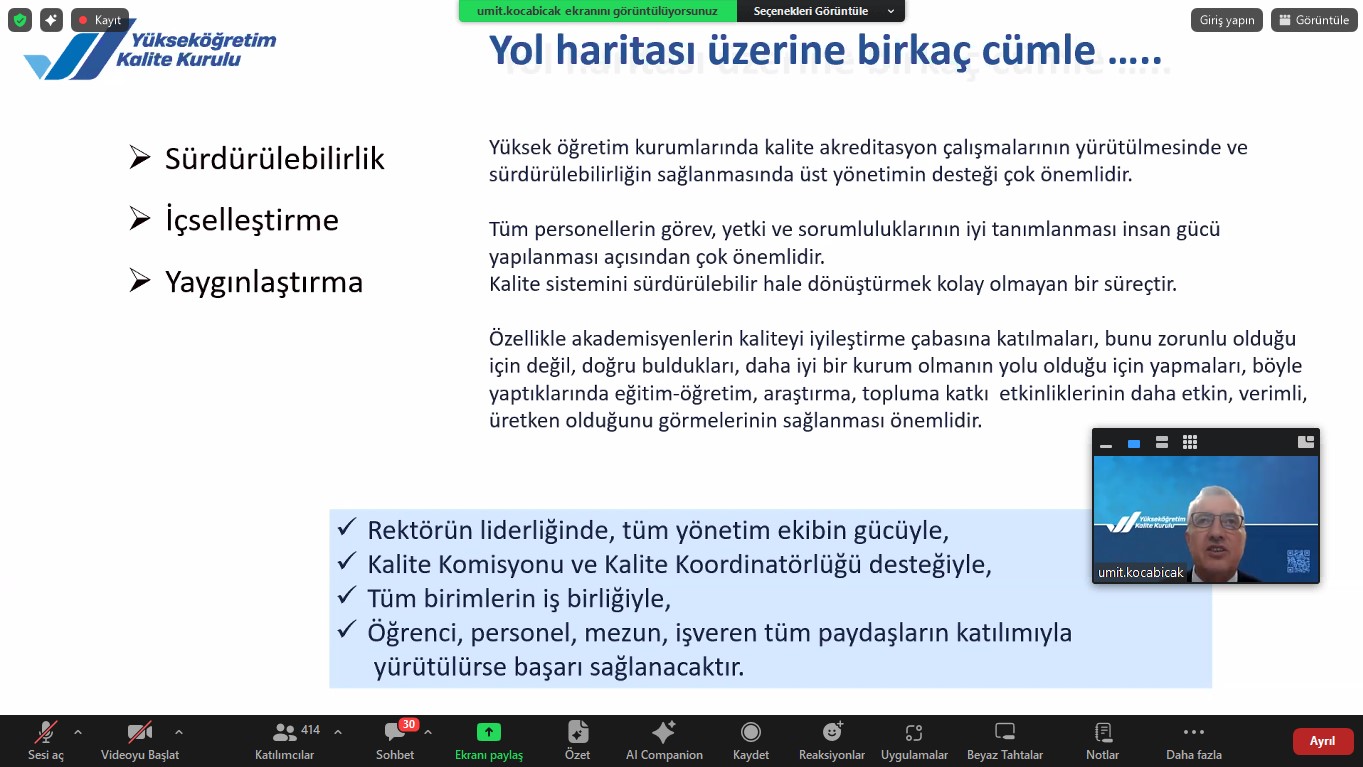 Çevrim içi olarak 14 Ocak 2025 tarihinde gerçekleştirilen eğitimde yükseköğretim kurumlarının kalite komisyonlarından temsilcileri ve Üniversitemiz Rektör Yardımcısı Prof.Dr.Orhan GÜNDÜZ ve Kalite Koordinatörü Doç.Dr.Gülçin BEKER AKBULUT yer aldı.